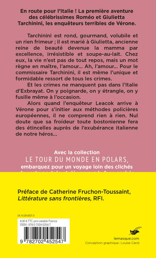 Alors quand l’enquêteur Leacok arrive à Vérone pour s’initier aux méthodes policières européennes, il ne comprend rien à rien. Nul doute que sa froideur toute bostonienne fera des étincelles auprès de l’exubérance italienne de notre héros...