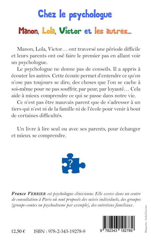 Manon, Lola, Victor ont traversé une période difficile et leurs parents ont osé faire le premier pas en allant voir un psychologue. Ce dernier ne donne pas de conseils. Il a appris à écouter les autres. Cette écoute permet de d'entendre ce qu'on n'ose pas toujours se dire, des choses que l'on se cache à soi-même pour ne pas souffrir par peur, par loyauté... Cela aide à mieux comprendre ce qui se passe dans notre vie. Ce n'est pas être mauvais parent que de s'adresser à un tiers qui n'est ni de la famille ni de l'école pour venir à bout de certaines difficultés. Un livre à lire seul ou avec ses parents pour échanger et mieux se comprendre.