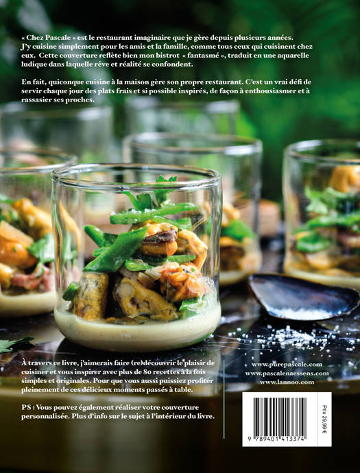 « Chez Pascale » est le restaurant imaginaire que je gère depuis plusieurs années. J'y cuisine simplement pour les amis et la famille, comme tous ceux qui cuisinent chez eux. Cette couverture reflète bien mon bistrot « fantasmé », traduit en une aquarelle ludique dans laquelle rêve et réalité se confondent.