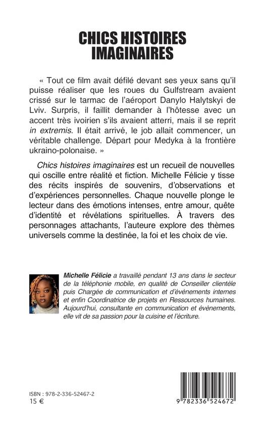 Tout ce film avait défilé devant ses yeux sans qu'il puisse réaliser que les roues du Gulfstream avaient crissé sur le tarmac de l'aéroport Danylo Halytskyi de Lviv. Surpris, il faillit demander à l'hôtesse avec un accent très ivoirien s'ils avaient atterri, mais il se reprit in extremis. Il était arrivé, le job allait commencer, un véritable challenge. Départ pour Medyka à la frontière ukraino-polonaise. Chics histoires imaginaires est un recueil de nouvelles qui oscille entre réalité et fiction. Michelle Félicie y tisse des récits inspirés de souvenirs, d'observations et d'expériences personnelles. Chaque nouvelle plonge le lecteur dans des émotions intenses, entre amour, quête d'identité et révélations spirituelles. À travers des personnages attachants, l'auteure explore des thèmes universels comme la destinée, la foi et les choix de vie.