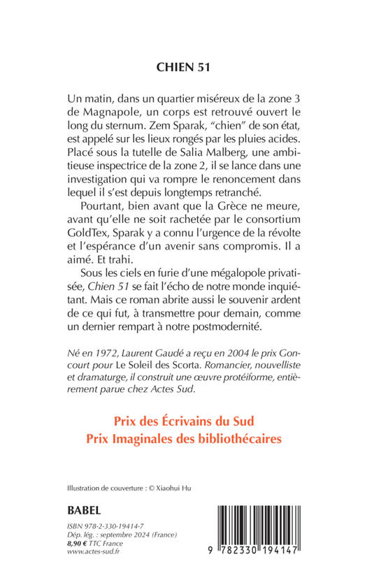 Un matin, dans un quartier miséreux de la zone 3 de Magnapole, un corps est retrouvé ouvert le long du sternum. Zem Sparak, "chien" de son état, est appelé sur les lieux rongés par les pluies acides. Placé sous la tutelle de Salia Malberg, une ambitieuse inspectrice de la zone 2, il se lance dans une investigation qui va rompre le renoncement dans lequel il s'est depuis longtemps retranché. Pourtant, bien avant que la Grèce ne meure, avant qu'elle ne soit rachetée par le consortium GoldTex, Sparak y a connu l'urgence de la révolte et l'espérance d'un avenir sans compromis. Il a aimé. Et trahi. Sous les ciels en furie d'une mégalopole privatisée, "Chien 51" se fait l'écho de notre monde inquiétant. Mais ce roman abrite aussi le souvenir ardent de ce qui fut, à transmettre pour demain, comme un dernier rempart à notre postmodernité.