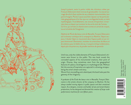 Ce nouveau livre de dessins de François Delaroziere nous fait découvrir les créatures merveilleuses qu'il imagine à partir de mythes ancestraux et méconnus. Jusqu'à présent, les spectateurs ignoraient ses motifs et les récits qu'il invente pour lui-même quand il conçoit ses animaux. Ce livre contient l'ensemble des dessins de ses créatures imaginaires. À chaque dessin, correspond deux histoires : le mythe qui inspire François Delaroziere et la fable qu'il compose pour donner vie à ses chimères.