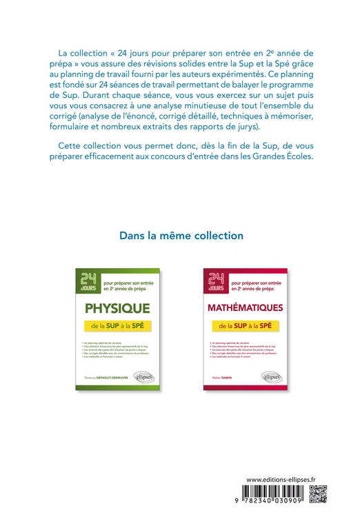 La collection « 24 jours pour préparer son entrée en 2e année de prépa » vous assure des révisions solides entre la Sup et la Spé grâce au planning de travail fourni par les auteurs expérimentés. Ce planning est fondé sur 24 séances de travail permettant de balayer le programme de Sup. Durant chaque séance, vous vous exercez sur un sujet puis vous vous consacrez à une analyse minutieuse de tout l'ensemble du corrigé (analyse de l’énoncé, corrigé détaillé, techniques à mémoriser, formulaire et nombreux extraits des rapports de jurys).