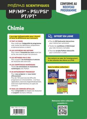 Toute la chimie dans un livre dédié aux prépas MP/MP*, PSI/PSI* et PT/PT*. Parfaitement à jour de la nouvelle réforme des classes préparatoires (2021-2022), il vous permettra de faire la différence en cours tout au long de la 2e année et pour la préparation aux épreuves de concours.