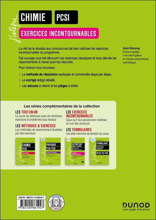 Vous avez besoin d’accompagnement pour appliquer votre cours de chimie ? Vous voulez être à l’aise face à tout exercice ? La clé de la réussite est de bien maîtriser les exercicesincontournables du programme. Cet ouvrage vous fait découvrir ces exercices et vous dévoileleurs méthodes de résolution. Pour chaque exercice, vous trouverez : • La méthode de résolution expliquée et commentée étape par étape, • Le corrigé détaillé rédigé, • Les astuces à retenir et les pièges à éviter.
