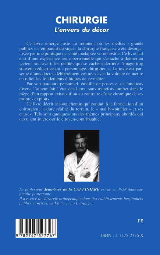La chirurgie a été désorganisées par une politique de santé inadaptée voire hostile. Ce livre s'attache à donner au lecteur non averti les réalités qui se cachent derrière l'image trop souvent réductrice du " personnage-chirurgien ". Le texte est parsemé d'anecdotes délibérément colorées avec la volonté de mettre en relief les fondements éthiques de ce métier. Ce livre décrit le long chemin qui conduit à la fabrication d'un chirurgien, la dure réalité de terrain, le " mal hospitalier " et ses ca...