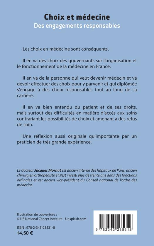 Les choix en médecine sont conséquents.Il en va des choix des gouvernants sur l'organisation et le fonctionnement de la médecine en France. Il en va de la personne qui veut devenir médecin et va devoir effectuer des choix pour y parvenir et qui diplômée s'engage à des choix responsables tout au long de sa carrière. Il en va bien entendu du patient et de ses droits, mais surtout des difficultés en matière d'accès aux soins contrariant les possibilités de choix et amenant à des refus de soin. Une réflexion aussi originale qu'importante par un praticien de très grande expérience.