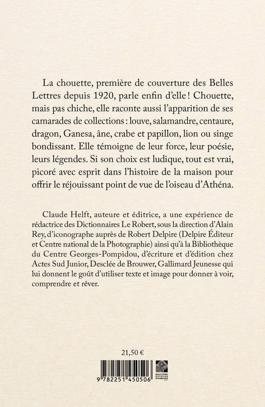La chouette, premiere de couverture des Belles Lettres depuis 1920, parle enfin d'elle ! Chouette, mais pas chiche, elle raconte aussi l'apparition de ses camarades de collections: louve, salamandre, centaure, dragon, Ganesa, ane, crabe et papillon, lion ou singe bondissant. Elle temoigne de leur force, leur poesie, leurs legendes. Si son choix est ludique, tout est vrai, picore avec esprit dans l'histoire de la maison pour offrir le rejouissant point de vue de l'oiseau d'Athena.