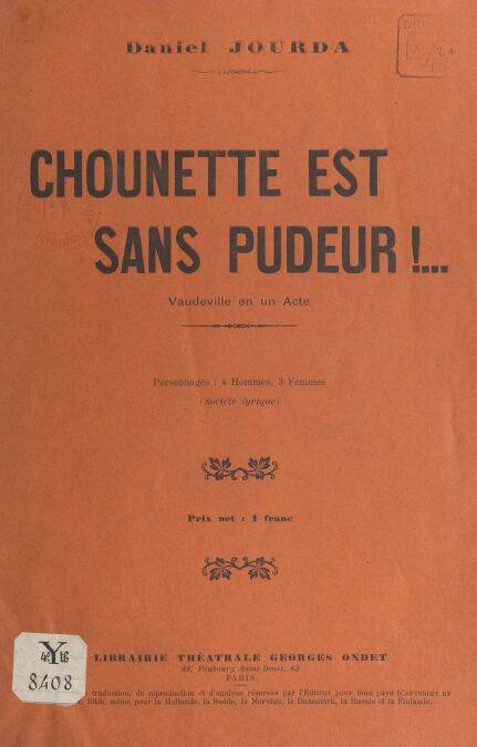 Vaudeville en un acte (4 hommes, 4 femmes). Représenté pour la première fois à Paris, à la Fauvette et à Chansonia (concerts Pacra)