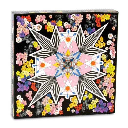 The Christian Lacroix Flowers Galaxy Double-Sided 500 Piece Jigsaw Puzzle features a geometric kaleidoscopic pattern combined with small scale multi-colored flowers on one side and a black and white typography with overlaid brightly colored fashion couture sketches on the other side. Christian Lacroix puzzles are packaged in a gorgeous sturdy box with shiny spot varnish detail, perfect for gifting and storage.