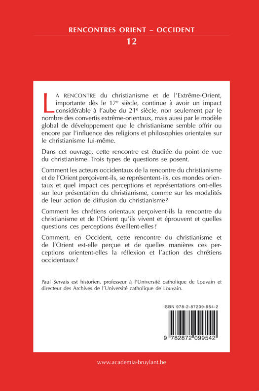 La rencontre du christianisme et de l'Extrême-Orient, importante dès le XVIIe siècle, continue à avoir un impact considérable à l'aube du XXIe siècle, non seulement par le nombre des convertis extrême-orientaux, mais aussi par le modèle global de développement que le christianisme semble offrir ou encore par l'influence des religions et philosophies orientales sur le christianisme lui-même. L'ouvrage interroge cette rencontre du point de vue du christianisme tant en Orient qu'en Occident.