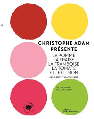 Le point commun entre la pomme, la fraise, la framboise, la tomate et le citron ? Ce sont des fruits accessibles, savoureux et colorés qui peuvent se décliner en une multitude de recettes salées et sucrées. Christophe Adam vous raconte ici ses histoires de goûts avec le citron et son concentré de fraîcheur ensoleillée et acidulée, avec la tomate rondelette et charnue aux multiples couleurs, avec le rouge vif de la fraise et son goût sucré printanier, avec la véritable bombe de goût qu’est la framboise, et avec le croquant et le fondant de la pomme.