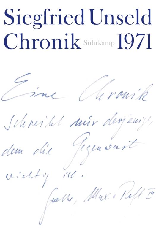 1970 begann Siegfried Unseld die Chronik - er notierte Ereignisse aus dem Verlagsalltag, Abenteuer mit den Autoren und Auseinandersetzungen mit der Öffentlichkeit. Im Jahr 1971 war er mit ganz spezifischen Herausforderungen konfrontiert. Nach dem Tod von Bertolt Brechts Witwe Helene Weigel galt es, den Zugriff der DDR-Regierung auf die Weltrechte an dessen Werk zu verhindern; die ersten Monate des Jahres standen im Zeichen der Lesereise Ingeborg Bachmanns mit ihrem ersten erfolgreichen Roman Malina, im September erschienen mit einem Schlag die ersten 20 Bände der suhrkamp taschenbücher, die es bei Buchhandel, Kritik und Lesern durchzusetzen galt. Siegfried Unseld bewies in all diesen Verwicklungen seine Doppelkapazitäten zur Streßresistenz und Simultankompetenz. Die Zeitschrift konkret, die damals auf ihre »linken« Ambitionen Wert legte, nannte ihn: »den Haifisch unter den Geschäftemachern in Sachen Literatur«. Siegfried Unseld seinerseits notiert gelassen:»Was ist die Erfahrung? Das machen, was man für richtig hält. Es gibt keine richtige Verlagsarbeit bei falschen Vorstellungen.«
