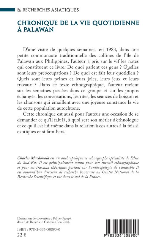 D’une visite de quelques semaines, en 1983, dans une petite communauté traditionnelle des collines de l’île de Palawan aux Philippines, l’auteur a pris sur le vif les notes qui constituent ce livre. De quoi parlent ces gens ? Quelles sont leurs préoccupations  ? De quoi est fait leur quotidien  ? Quels sont leurs peines et leurs joies, leurs jeux et leurs travaux ? Dans ce texte ethnographique, l’auteur revient sur les semaines passées dans ce groupe et sur les propos échangés, les conversations, les rites, les séances de boisson et les chansons qui émaillent avec une joyeuse constance la vie de cette population autochtone.