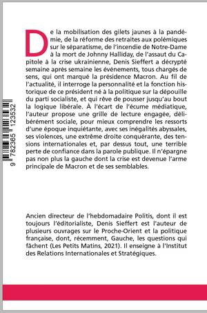 Éditorialiste depuis vingt ans de l’hebdomadaire Politis, Denis Sieffert a réuni ici une sélection d’une soixantaine de textes qui couvre les cinq années de la présidence Macron. Il propose une grille de lecture originale des grands débats et des conflits qui ont jalonné ces années. Au fil des événements, il interroge les évolutions d’une personnalité qui, apôtre du « ni droite ni gauche », a fini par fracturer la société et favoriser la droitisation extrême du paysage politique. Denis Sieffert revient aussi sur des événements qui ont mobilisé, inquiété ou ému l’opinion dont il met en évidence le sens politique : que signifie l’émotion populaire suscitée par la disparition de Johnny Halliday ? Que nous disent de notre époque les réactions à l’incendie de Notre-Dame ? Ou les hommages à Jacques Chirac et à Bernard Tapie, en passant par la liesse permissive qui a accompagné la victoire de la France à la coupe du monde de football ? Mais ce sont surtout les débats sur les retraites, la laïcité, le « séparatisme », la fin de vie, avec l’affaire Vincent Lambert, et évidemment la crise des gilets jaunes, que l’on retrouve dans ces pages, tels qu’ils ont été vécus et analysés dans l’instant. <br /><br /> L’auteur revient aussi sur les ambivalences de la fameuse diplomatie de la tape dans le dos, face à Trump ou Poutine. Il rappelle quelques compromissions que la realpolitik ne suffit pas à expliquer, comme cette « légion de déshonneur » décernée au dictateur égyptien Al-Sissi. Il interroge enfin l’institution présidentielle dont Emmanuel Macron a accentué la verticalité, notamment dans la gestion de la pandémie. Des questions de pleine actualité.<br /><br /> Denis Sieffert n’épargne pas non plus la gauche dont la faiblesse historique est le meilleur atout de Macron. Il livre sur tous ces sujets une analyse qui échappe aux effets de meute médiatiques, et se garde, malgré la sévérité de la critique, de tout esprit de système qui ferait de la contradiction son objet principal.