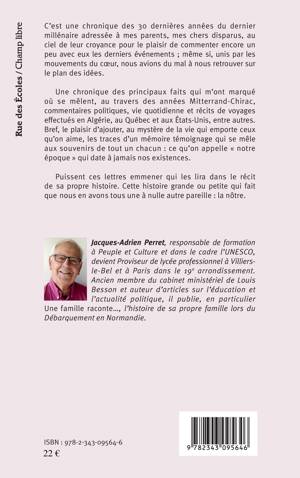 C'est une chronique des 30 dernières années adressée à mes parents, mes chers disparus, au ciel de leur croyance pour le plaisir de commenter encore un peu avec eux les derniers événements ; même si, unis par les mouvements du coeur, nous avions du mal à nous retrouver sur le plan des idées. Une chronique des principaux faits qui m'ont marqué où se mêlent, au travers des années Mitterrand-Chirac, commentaires politiques, vie quotidienne et récits de voyages effectués en Algérie, au Québec et aux États-Unis, entre autres. Bref, le plaisir d'ajouter, au mystère de la vie qui emporte ceux qu'on aime, les traces d'un témoignage qui se mêle aux souvenirs de tout un chacun : ce qu'on appelle « notre époque » qui date à jamais nos existences.