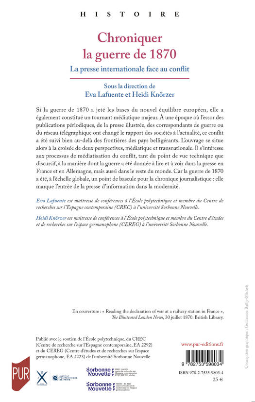 Si la guerre de 1870 a jeté les bases du nouvel équilibre européen, elle a également constitué un tournant médiatique majeur. À une époque où l’essor des publications périodiques, de la presse illustrée, des correspondants de guerre ou du réseau télégraphique ont changé le rapport des sociétés à l’actualité, ce conflit a été suivi bien au-delà des frontières des pays belligérants. L’ouvrage se situe alors à la croisée de deux perspectives, médiatique et transnationale. Il s’intéresse aux processus de médiatisation du conflit, tant du point de vue technique que discursif, à la manière dont la guerre a été donnée à lire et à voir dans la presse en France et en Allemagne, mais aussi dans le reste du monde. Car la guerre de 1870 a été, à l’échelle globale, un point de bascule pour la chronique journalistique : elle marque l’entrée de la presse d’information dans la modernité.