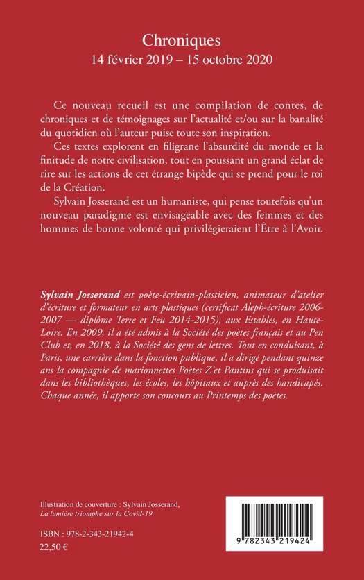 Ce nouveau recueil est une compilation de contes, de chroniques et de témoignages sur l'actualité et/ou sur la banalité du quotidien où l'auteur puise toute son inspiration. Ces textes explorent en filigrane l'absurdité du monde et la finitude de notre civilisation, tout en poussant un grand éclat de rire sur les actions de cet étrange bipède qui se prend pour le roi de la Création. Sylvain Josserand est un humaniste, qui pense toutefois qu'un nouveau paradigme est envisageable avec des femmes et des hommes de bonne volonté qui privilégier aient l'Être à l'Avoir.