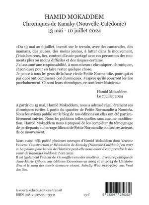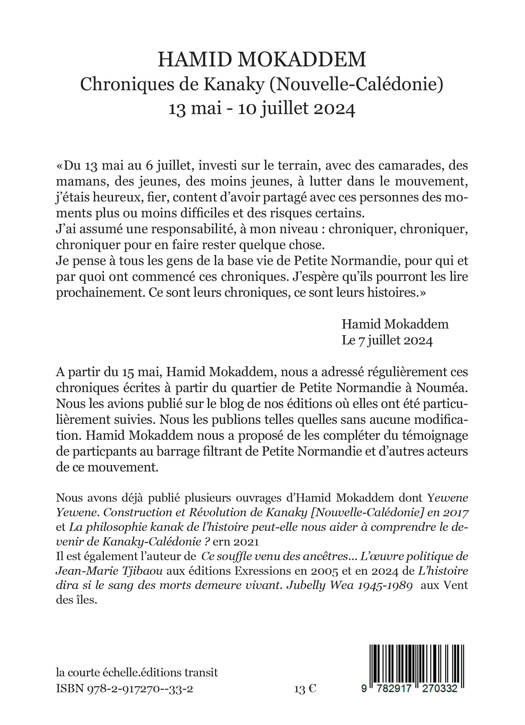 Du 13 mai au 10 juillet 2024 Hamid Mokaddem, enseignant, chercheur et militant en Kanaky (Nouvelle-Calédonie) a écrit des chroniques régulières qui se déroulent essentiellement sur, et autour du, barrage filtrant installé par les habitants du quartier de Petite Normandie à Nouméa. Publiées sur notre site, ces chroniques sont le reflet de ce qu’a pu être la vie quotidienne sur cette base-vie avec ses discussions, ses rencontres et des analyses à chaud pendant ces journées d’affrontements et de révolte de la jeunesse face au mépris et à la violence coloniale.