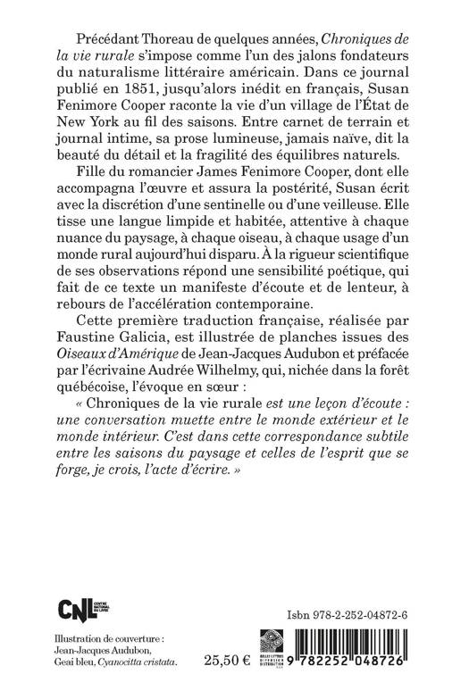 Cette première traduction française, réalisée par Faustine Galicia, est illustrée de planches issues des Oiseaux d’Amérique de Jean-Jacques Audubon et préfacée par l’écrivaine Audrée Wilhelmy, qui, nichée dans la forêt québécoise, l’évoque en soeur : « Chroniques de la vie rurale est une leçon d’écoute : une conversation muette entre le monde extérieur et le monde intérieur. C’est dans cette correspondance subtile entre les saisons du paysage et celles de l’esprit que se forge, je crois, l’acte d’écrire. »