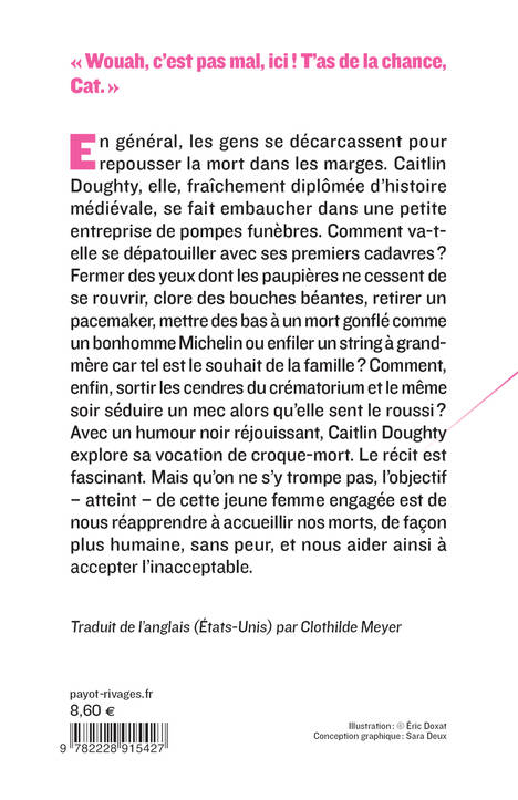En général, les gens se décarcassent pour repousser la mort dans les marges. Caitlin Doughty, elle, fraîchement diplômée d'histoire médiévale, se fait embaucher dans une petite entreprise de pompes funèbres. Comment va-t-elle se dépatouiller avec ses premiers cadavres ? Fermer des yeux dont les paupières ne cessent de se rouvrir, clore des bouches béantes, retirer un pacemaker, mettre des bas à un mort gonflé comme un bonhomme Michelin ou enfiler un string à grand-mère car tel est le souhait de la famille ? Comment enfin sortir les cendres du crématorium et le même soir séduire un mec alors qu'elle sent le roussi ? Avec un humour noir réjouissant, Caitlin Doughty explore sa vocation de croque-mort. Le récit est fascinant. Qu'on ne s'y trompe pas pourtant, l'objectif - atteint - de cette jeune femme engagée est de nous réapprendre à accueillir nos morts, de façon plus humaine, sans peur, et nous aider ainsi à accepter l'inacceptable.