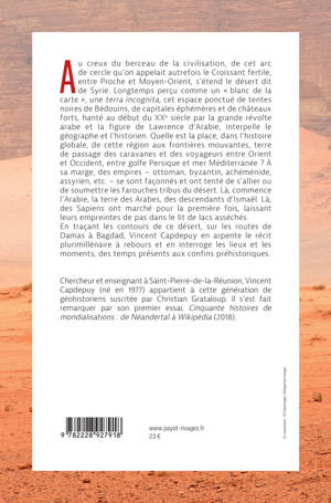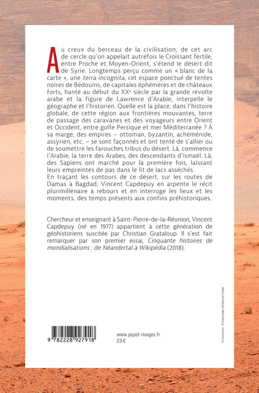 Au creux du berceau de la civilisation, de cet arc de cercle qu'on appelait autrefois le Croissant fertile, entre Proche et Moyen-Orient, s'étend le désert dit de Syrie. Longtemps perçu comme un « blanc de la carte », une «terra incognita», cet espace ponctué de tentes noires de Bédouins, de capitales éphémères et de châteaux forts, hanté au début du XXe siècle par la grande révolte arabe et la figure de Lawrence d'Arabie, interpelle le géographe et l'historien. Quelle est la place, dans l'histoire globale, de cette région aux frontières mouvantes, terre de passage des caravanes et des voyageurs entre Orient et Occident, entre golfe Persique et mer Méditerranée ? À sa marge, des empires - ottoman, byzantin, achéménide, assyrien, etc. - se sont façonnés et ont tenté de s'allier ou de soumettre les farouches tribus du désert. Là, commence l'Arabie, la terre des Arabes, des descendants d'Ismaël. Là, des «Sapiens» ont marché pour la première fois, laissant leurs empreintes de pas dans le lit de lacs asséchés.