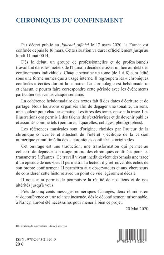 Par décret publié au Journal officiel le 17 mars 2020, la France est confinée depuis le 16 mars. Cette situation va durer officiellement jusqu'au lundi 11 mai 00h. Dès le début, un groupe de professionnelles et de professionnels travaillant dans les métiers de l'humain décide de tisser un lien au-delà des confinements individuels. Chaque semaine un tome (de 1 à 8) sera édité sous une forme numérique à usage interne. Il regroupera les « chroniques confinées » écrites durant la semaine. La chronologie est hebdomadaire et chacun.e pourra faire correspondre cette période avec les événements particuliers survenus chaque semaine.