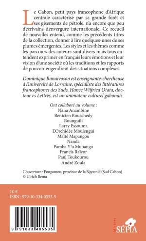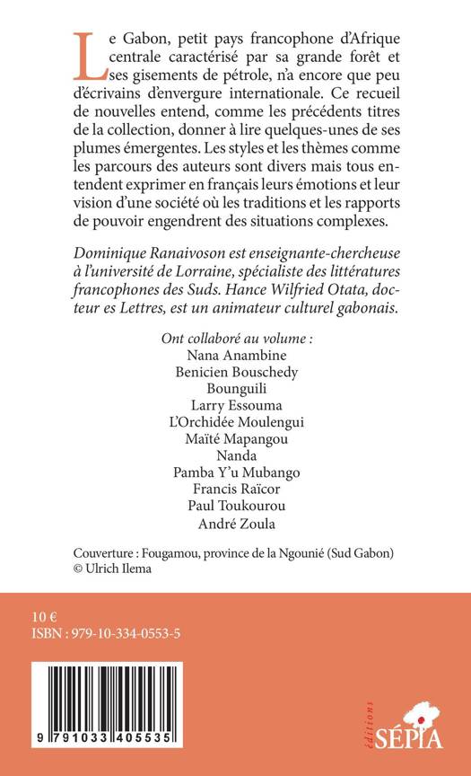 Le Gabon, petit pays francophone d'Afrique centrale caractérisé par sa grande forêt et ses gisements de pétrole, n'a encore que peu d'écrivains d'envergure internationale. Ce recueil de nouvelles entend, comme les précédents titres de la collection, donner à lire quelques-unes de ses plumes émergentes. Les styles et les thèmes comme les parcours des auteurs sont divers mais tous entendent exprimer en français leurs émotions et leur vision d'une société où les traditions et les rapports de pouvoir engendrent des situations complexes. Dominique Ranaivoson est enseignante-chercheuse à l'université de Lorraine, spécialiste des littératures francophones des Suds. Hance Wilfried Otata, docteur es Lettres, est un animateur culturel gabonais.