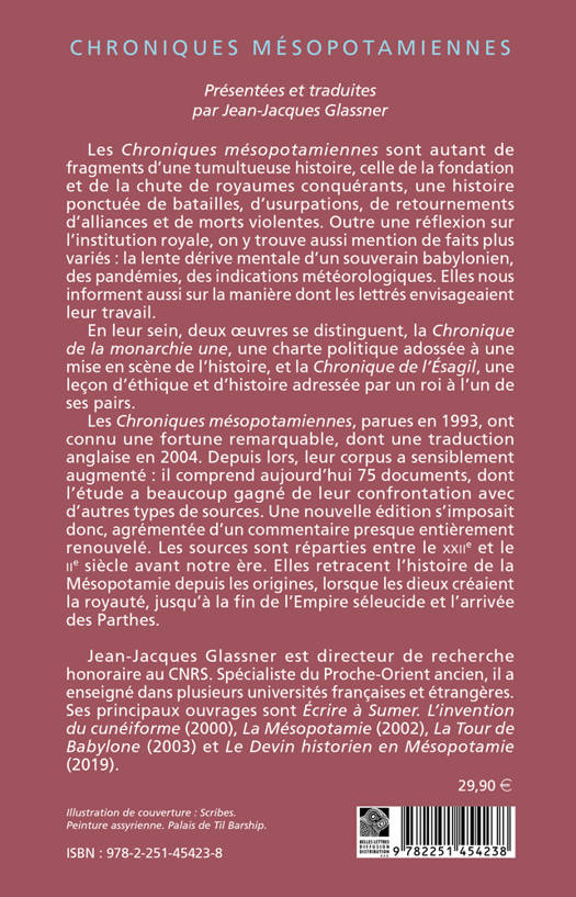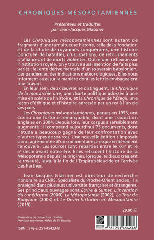 Les Chroniques mesopotamiennes sont autant de fragments d'une tumultueuse histoire, celle de la fondation et de la chute de royaumes conquerants, une histoire ponctuee de batailles, d'usurpations, de retournements d'alliances et de morts violentes. Outre une reflexion sur l'institution royale, on y trouve aussi mention de faits plus varies: la lente derive mentale d'un souverain babylonien, des pandemies, des indications meteorologiques. Elles nous informent aussi sur la maniere dont les lettres envisageaient leur travail. En leur sein, deux oeuvres se distinguent, la Chronique de la monarchie une, une charte politique adossee a une mise en scene de l'histoire, et la Chronique de l'Esagil, une lecon d'ethique et d'histoire adressee par un roi a l'un de ses pairs. Les Chroniques mesopotamiennes, parues en 1993, ont connu une fortune remarquable, dont une traduction anglaise en 2004. Depuis lors, leur corpus a sensiblement augmente: il comprend aujourd'hui 75 documents, dont l'etude a beaucoup gagne de leur confrontation avec d'autres types de sources. Une nouvelle edition s'imposait donc, agrementee d'un commentaire presque entierement renouvele. Les sources sont reparties entre le XXIIe et le IIe siecle avant notre ere. Elles retracent l'histoire de la Mesopotamie depuis les origines, lorsque les dieux creaient la royaute, jusqu'a la fin de l'Empire seleucide et l'arrivee des Parthes.