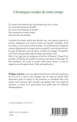 Il y aurait trois histoires qui n'arrêteraient pas de se croiser. Ce serait des histoires de famille. Il y aurait trois histoires de famille. On raconterait en même temps. L'histoire de trois familles. A présent les années noires sont derrière eux, nos paysans peuvent se tourner résolument vers l'avenir. Enfin nos Sevestre céréaliers. Pour les autres, ça n'est pas la même histoire: les d'Harmereau s'éteignent comme disparaissent les temps anciens, quand il y avait encore des rois. Et pour les Barentin, peu de choses au fond ont changé. N'empêche, c'est l'heure des grands bouleversements du monde rural. Mais il ne s'agit pas ici seulement d'un livre d'histoire. Puisqu'il est question d'histoires de famille il convient sans doute d'interroger les liens familiaux. Ici ce qui est scruté, entre autres choses, ce sont les rapports entre les générations. Enfin principalement...