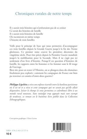 Il y aurait trois histoires qui n’arrêteraient pas de se croiser Ce serait des histoires de famille Il y aurait trois histoires de famille On raconterait en même temps L’histoire de trois familles Voilà pour le principe de base qui nous permettra d’accompagner ces trois familles depuis la Grande Guerre jusqu’à la fin des Trente glorieuses. Ce premier tome couvre les premières décennies du vingtième siècle. Pour être précis depuis la Première Guerre mondiale jusqu’à la mobilisation pour la Seconde. Mais il ne s’agit pas ici seulement d’un livre d’histoire. Puisqu’il est question d’histoires de famille, les rapports entre les hommes et les femmes sont le fil rouge de l’ouvrage. Bien sûr, pour en rester à l’Histoire, on se plongera dans des domaines finalement peu explorés : comment les campagnes de France ont bien pu traverser ces années d’entre-deux guerres ?