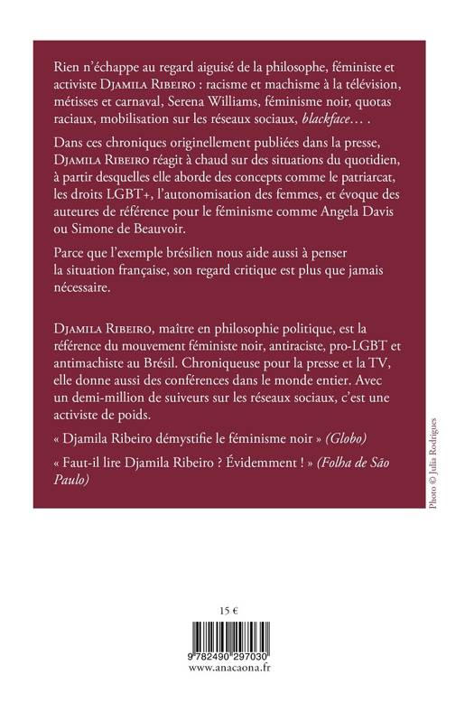 Racisme et machisme à la télévision, métisses et carnaval, Serena Williams, féminisme noir, quotas raciaux, mobilisation sur les réseaux sociaux, blackface... Rien n'échappe au regard aiguisé de la philosophe, féministe et activiste Djamila Ribeiro. Dans ces chroniques originellement publiées dans la presse, Djamila Ribeiro réagit à chaud sur des situations du quotidien, à partir desquelles elle aborde des concepts comme le patriarcat, les droits LGBT+, l'autonomisation des femmes, et évoque des auteures de référence pour le féminisme comme Angela Davis ou Simone de Beauvoir. Parce que l'exemple brésilien nous aide aussi à penser la situation française, son regard critique est plus que jamais nécessaire. DJAMILA RIBEIRO maître en philosophie politique, est la référence du mouvement féministe noir, antiraciste, pro-LGBT et antimachiste au Brésil. Chroniqueuse pour la presse et la TV, elle donne aussi des conférences dans le monde entier. Avec un demi-million de suiveurs sur les réseaux sociaux, c'est une activiste de poids. « Djamila Ribeiro démystifie le féminisme noir » (Globo) « Faut-il lire Djamila Ribeiro ? Évidemment ! » (Folha de São Paulo)