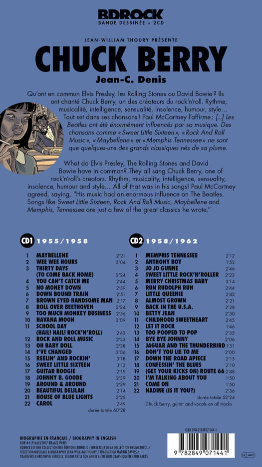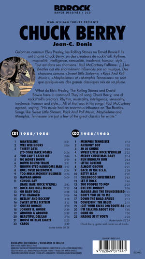 La biographie de Chuck Berry, écrite par Jean William Thoury, illustrée par Jean-C. Denis, accompagnée de 2 compacts discs. CHUCK BERRY<br /> Let It Rock !<br /> Qu’ont en commun Elvis Presley, les Rolling Stones ou David Bowie ? Ils ont chanté Chuck Berry, un des créateurs du rock’n’roll. Rythme, musicalité, intelligence, sensualité, insolence, humour, style... Tout est dans ses chansons ! Paul McCartney l’affirme : [...] Les Beatles ont été énormément influencés par sa musique. Des chansons comme « Sweet Little Sixteen », « Rock And Roll Music », « Maybellene » et « Memphis Tennessee » ne sont que quelques-uns des grands classiques nés de sa plume.<br />