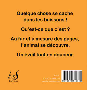Quelque chose se cache dans les buissons ! Qu’est-ce que c’est ? Au fur et à mesure des pages, l’animal se découvre. Un éveil tout en douceur.