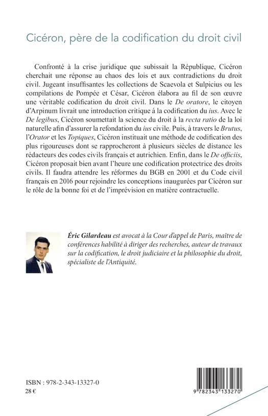 Confronté à la crise subie par la République, Cicéron cherchait une réponse au chaos des lois et aux contradictions du droit civil. Il en élabora une véritable codification. Du "De oratore" au "De officiis", il critiqua la science du droit et la soumit à la loi naturelle, avant d'instituer une méthode de codification protectrice des droits civils, dont se rapprocheront les codes civils français et autrichien. Il faut attendre les réformes du Code civil allemand de 2001 et du Code civil français de 2016 pour rejoindre Cicéron sur le rôle de la bonne foi et de l'imprévision en matière contractuelle.