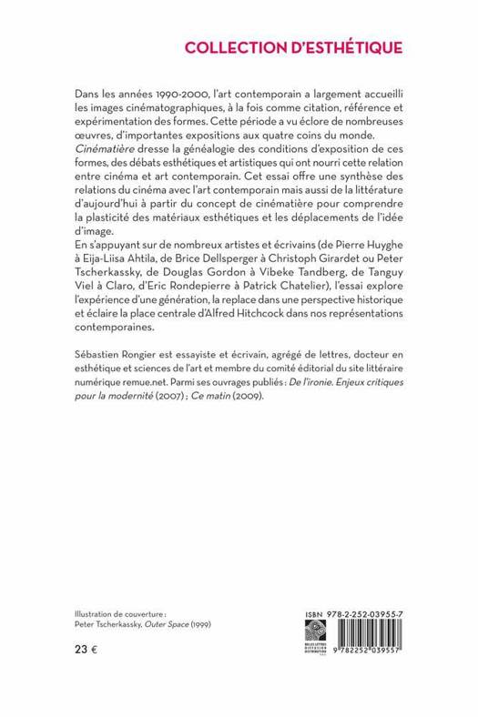 English summary: Contemporary art fully embraced cinematography during the 1990s. The present volume traces the genealogy and esthetic and artistic debates that framed the encounter of cinema and art. Exploring the experience of a generation, the essay likewise examines Alfred Hitchcock's place in contemporary art. French description: Dans les annees 1990-2000, l'art contemporain a largement accueilli les images cinematographiques, a la fois comme citation, reference et experimentation des formes. Cette periode a vu eclore de nombreuses oeuvres, d'importantes expositions aux quatre coins du monde. Cinematiere dresse la genealogie des conditions d'exposition de ces formes, des debats esthetiques et artistiques qui ont nourri cette relation entre cinema et art contemporain. Cet essai offre une synthese des relations du cinema avec l'art contemporain mais aussi de la litterature d'aujourd'hui a partir du concept de cinematiere pour comprendre la plasticite des materiaux esthetiques et les deplacements de l'idee d'image. En s'appuyant sur de nombreux artistes et ecrivains (de Pierre Huyghe a Eija-Liisa Ahtila, de Brice Dellsperger a Christoph Girardet ou Peter Tscherkassky, de Douglas Gordon a Vibeke Tandberg, de Tanguy Viel a Claro, d'Eric Rondepierre a Patrick Chatelier), l'essai explore l'experience d'une generation, la replace dans une perspective historique et eclaire la place centrale d'Alfred Hitchcock dans nos representations contemporaines.