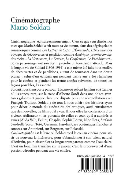Cinématographe : écriture en mouvement. C’est ce que veut dire le mot et ce que Mario Soldati a fait toute sa vie durant, dans des dégringolades romanesques comme Les Lettres de Capri, L’Émeraude, L’Incendie, des voyages de découvertes et perdition comme Amérique, premier amour, des récits – La Veste verte, La Fenêtre, La Confession, Le Vrai Silvestri – où un personnage voit son destin prendre un tournant inattendu. Mais la longue vie de Soldati (1906-1999) a elle-même été faite tout entière de découvertes et de perditions, autant de tournants dans un destin pluriel : celui d’un écrivain qui pendant trente ans a été réalisateur pour le cinéma et pendant les trente années suivantes, de toutes les façons possibles, l’a raconté. Soldati nous transporte partout : à Rome où se font les films et à Cannes où ils concourent, sur la trace d’Alberto Sordi dans une de ses aventures galantes et jusque dans une dispute puis une réconciliation avec François Truffaut. Soldati a de tout à nous offrir : des histoires ayant pour décor le monde du cinéma ou des critiques, aussi entraînantes que des nouvelles, de films qu’il a vus. Il nous offre les confessions d’un « vieux réalisateur », les portraits de celles et ceux qu’il a admirés et aimés (Alida Valli, Fellini, Chaplin, Sophia Loren, Nino Rota, Stefania Sandrelli, Sordi, Totò, Gassman, Pasolini), ses polémiques franches et sonores sur Antonioni, sur Bergman, sur Polanski. Cinématographe est le livre où Soldati tord le cou au cinéma pour sai¬sir de nouveau la littérature, pour s’abandonner à son talent naturel d’écrivain, pour laisser filer sa langue transparente comme l’eau claire. C’est un long film transféré sur le papier, c’est le procès-verbal d’une passion déroulée pendant une vie entière.