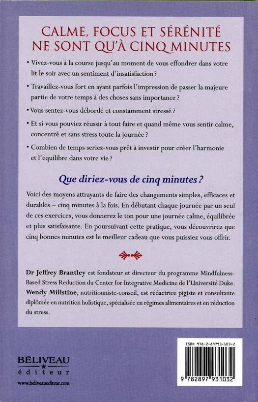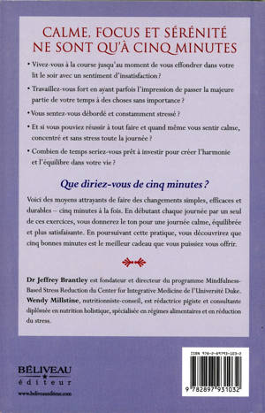 Vivez-vous à la course jusqu’au moment de vous effondrer dans votre lit le soir avec un sentiment d’insatisfaction ? Travaillez-vous fort en ayant parfois l’impression de passer la majeure partie de votre temps à des choses sans importance ? Vous sentez-vous débordé et constamment stressé ? Et si vous pouviez réussir à tout faire et quand même vous sentir calme, concentré et sans stress toute la journée ! Combien de temps seriez-vous prêt à investir pour créer l’harmonie et l’équilibre dans votre vie ? Que diriez-vous de cinq minutes ?