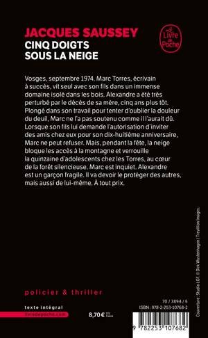 Vosges, septembre 1974. Marc Torres, écrivain à succès, vit seul avec son fils dans un immense domaine isolé dans les bois. Alexandre a été très perturbé par le décès de sa mère, cinq ans plus tôt. Plongé dans son travail pour tenter d’oublier la douleur du deuil, Marc ne l’a pas soutenu comme il l’aurait dû. Lorsque son fils lui demande l’autorisation d’inviter des amis chez eux pour son dix-huitième anniversaire, Marc ne peut refuser. Mais, pendant la fête, la neige bloque les accès à la montagne et verrouille la quinzaine d’adolescents chez les Torres, au cœur de la forêt silencieuse. Marc est inquiet. Alexandre est un garçon fragile. Il va devoir le protéger des autres, mais aussi de lui-même. À tout prix.