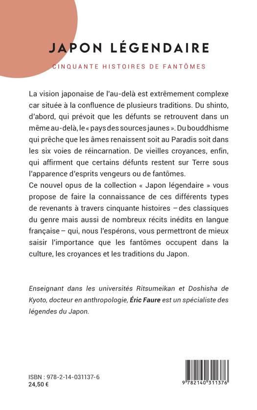 La vision japonaise de l'au-delà est extrêmement complexe car située à la confluence de plusieurs traditions. Du shinto, d'abord, qui prévoit que les défunts se retrouvent dans un même au-delà, le « pays des sources jaunes ». Du bouddhisme qui prêche que les âmes renaissent soit au Paradis soit dans les six voies de réincarnation. De vieilles croyances, enfin, qui affirment que certains défunts restent sur Terre sous l'apparence d'esprits vengeurs ou de fantômes. Ce nouvel opus de la collection « Japon légendaire » vous propose de faire la connaissance de ces différents types de revenants à travers cinquante histoires – des classiques du genre mais aussi de nombreux récits inédits en langue française – qui, nous l'espérons, vous permettront de mieux saisir l'importance que les fantômes occupent dans la culture, les croyances et les traditions du Japon.