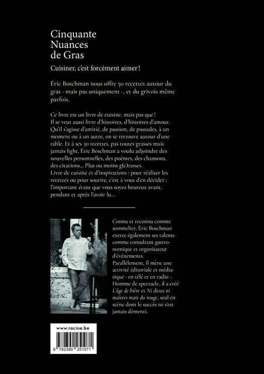Ce livre est un livre de cuisine, mais pas que ! Il se veut aussi livre d'histoires, d'histoires d'amour. Qu'il s'agisse d'amitié, de passion, de passades, à un moment ou à un autre, on se retrouve autour d'une table. Et à ses 50 recettes, pas toutes grasses mais jamais light, Éric Boschman a voulu adjoindre des nouvelles personnelles, des poèmes, des chansons, des citations... Plus ou moins g(c)rasses.