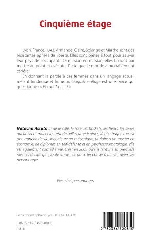 Lyon, France, 1943. Armande, Claire, Solange et Marthe sont des résistantes éprises de liberté. Elles sont prêtes à tout pour sauver leur pays de l'occupant. De mission en mission, elles finiront par mettre au point et exécuter l'acte que le monde a probablement espéré. En donnant la parole à ces femmes dans un langage actuel, mêlant tendresse et humour, Cinquième étage est une pièce qui questionne: Et moi ? et si ?