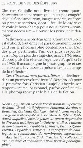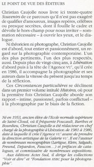 Christian Caujolle nous livre ici trente-quatre Souvenirs de ce parcours qu'il n'est pas exagéré de qualifier d'amoureux, images repères, célèbres ou presque secrètes, dont il fouille le cadre et dévoile le hors-champ pour nous inviter - sommation nécessaire - à ouvrir les yeux, et le dialogue. Ni théoricien ni photographe, Christian Caujolle est d'abord, tout entier et passionnément, un regard sur la photographie contemporaine. L'un des plus pertinents, l'un des plus respectés, aussi. Depuis plus de vingt-cinq ans, à Libération d'abord puis à la tête de l'Agence vu', qu'il crée en 1986, il accompagne la photographie et ses auteurs dans la vitesse du présent jusqu'au temps de la réflexion. Ces Circonstances particulières se déclinent dans un premier volume intitulé Histoires, où pour la première fois Christian Caujolle aborde son rapport - intime, passionnel, parfois conflictuel -à la photographie par le biais de la fiction.