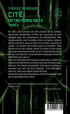 En 2033, les humains ont été chassés de la surface, désormais inhabitable. À Paris, les survivants se sont réfugiés dans les profondeurs du métropolitain. Des communautés sont installées dans certaines stations de Rive Gauche, plus ou moins en contact, souvent en conflit ; la surface est crainte parce qu’irradiée ; Rive Droite est un lieu maudit, laissé à la merci d’une faune sauvage monstrueuse. Mais n’y a-t-il vraiment personne là-haut, ou cherche-t-on à maintenir coûte que coûte les Métrolites sous terre ? Dans les méandres des boyaux souterrains, à défaut de lumière, les émotions sont plus vives, les rancœurs plus tenaces, les haines exacerbées. Une œuvre sombre et baroque, qui tient du récit hugolien : Les Misérables, bien sûr, mais aussi Notre-Dame de Paris.