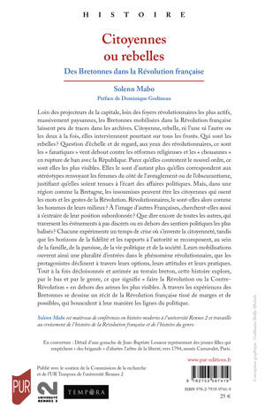 Loin des projecteurs de la capitale, loin des foyers révolutionnaires les plus actifs, massivement paysannes, les Bretonnes mobilisées dans la Révolution française laissent peu de traces dans les archives. Citoyenne, rebelle, ni l’une ni l’autre ou les deux à la fois, elles interviennent pourtant sur tous les fronts. Qui sont les rebelles ? Question d’échelle et de regard, aux yeux des révolutionnaires, ce sont les « fanatiques » vent debout contre les réformes religieuses et les « chouannes » en rupture de ban avec la République. Parce qu’elles contestent le nouvel ordre, ce sont elles les plus visibles. Elles le sont d’autant plus qu’elles correspondent aux stéréotypes renvoyant les femmes du côté de l’aveuglement ou de l’obscurantisme, justifiant qu’elles soient tenues à l’écart des affaires politiques. Mais, dans une région comme la Bretagne, les insoumises peuvent être les citoyennes qui osent les mots et les gestes de la Révolution. Révolutionnaires, le sont-elles alors comme les hommes de leurs milieux ? À l’image d’autres Françaises, cherchent-elles aussi à s’extraire de leur position subordonnée ? Que dire encore de toutes les autres, qui traversent les événements à pas discrets ou en dehors des sentiers politiques les plus balisés ? Chacune expérimente un temps de crise où s’invente la citoyenneté, tandis que les horizons de la fidélité et les rapports à l’autorité se recomposent, au sein de la famille, de la paroisse, de la vie politique et de la société. Leurs mobilisations ouvrent ainsi une pluralité d’entrées dans le phénomène révolutionnaire, que les protagonistes déclinent à travers leurs options, leurs attitudes et leurs pratiques. Tout à la fois décloisonnée et arrimée au terrain breton, cette histoire explore, par le bas et par le genre, ce que signifie « faire la Révolution ou la Contre- Révolution » en dehors des arènes les plus visibles. À travers les expériences des Bretonnes se dessine un récit de la Révolution française tissé de marges et de possibles, qui bousculent à leur manière les lignes du politique.