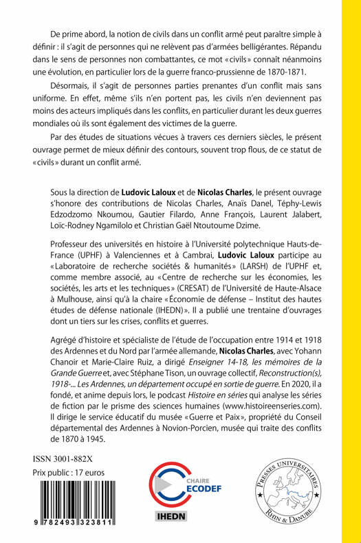 De prime abord, la notion de civils dans un conflit armé peut paraître simple à définir : il s’agit de personnes qui ne relèvent pas d’armées belligérantes. Répandu dans le sens de personnes non combattantes, ce mot de « civils » connaît néanmoins une évolution, en particulier lors de la guerre franco-prussienne de 1870-1871. Désormais, il s’agit de personnes parties prenantes d’un conflit mais sans uniforme. En effet, même s’ils ne portent pas d’uniforme, les civils n’en deviennent pas moins des acteurs à part entière des conflits, en particulier durant les deux guerres mondiales où ils sont également des victimes de la guerre. Par des études de situations vécues à travers ces derniers siècles, le présent ouvrage permet de mieux définir des contours, souvent trop flous, de ce statut de « civils » durant un conflit armé.
