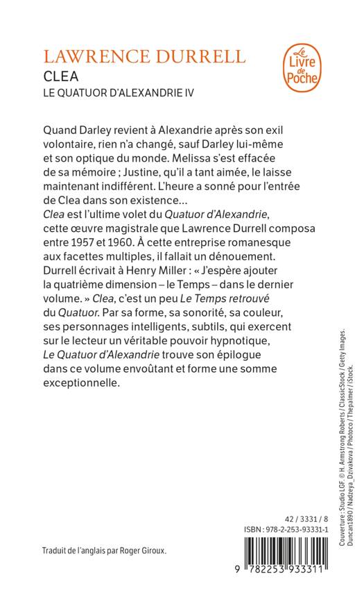 À cette entreprise romanesque aux facettes multiples, il fallait un dénouement. Ce sera donc Clea. Durrell écrivait à Henry Miller : «J'espère ajouter la quatrième dimension - Le Temps dans le dernier volume. » Clea, c'est un peu le « Temps retrouvé » du Quatuor. L'action désormais se situe après les événements rapportés dans Justine, Balthazar et Mountolive. Le narrateur quitte son île pour revenir à Alexandrie. La guerre touche à sa fin. Justine a vieilli, Balthazar est malade et solitaire. Seule, Clea, l'artiste, et, bien sûr, Alexandrie ont gardé leur pouvoir de séduction.