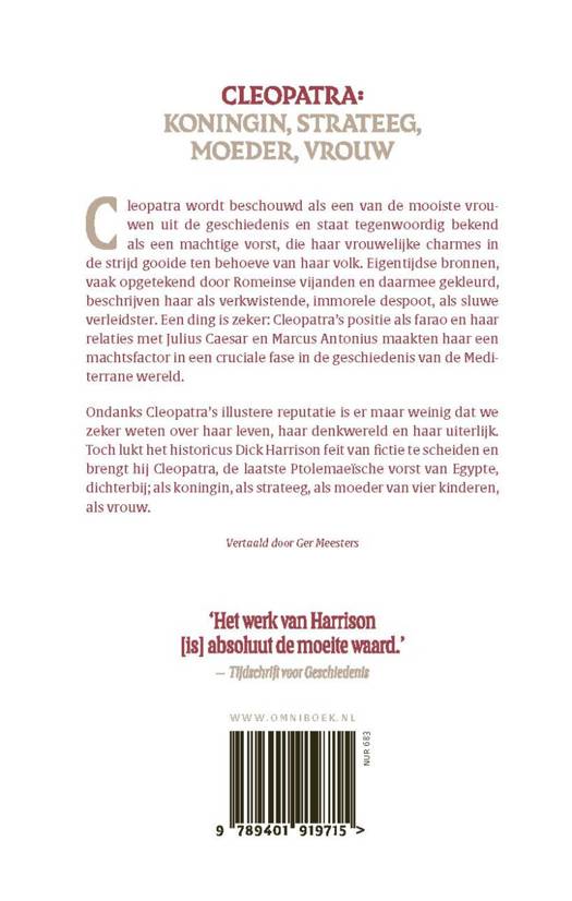 Cleopatra wordt beschouwd als een van de mooiste vrouwen uit de geschiedenis en staat tegenwoordig bekend als een machtige vorst, die haar vrouwelijke charmes in de strijd gooide ten behoeve van haar volk. Eigentijdse bronnen beschrijven haar als verkwistende, immorele despoot, als sluwe verleidster. Een ding is zeker: Cleopatra's positie als farao en haar relaties met Julius Caesar en Marcus Antonius maakten haar een machtsfactor in een cruciale fase in de geschiedenis van de Mediterrane wereld. In deze rijk geïllustreerde biografie ontrafelt Dick Harrison kundig Cleopatra's figuur en haar leefwereld.