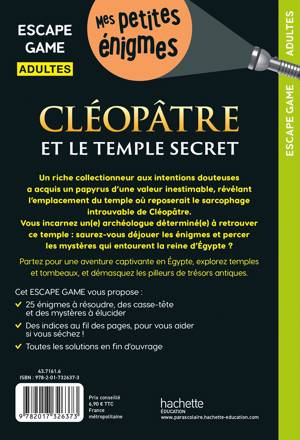 Un riche collectionneur aux intentions douteuses a acquis un papyrus d’une valeur inestimable, révélant l’emplacement du temple où reposerait le sarcophage introuvable de Cléopâtre. Vous incarnez un(e) archéologue déterminé(e) à retrouver ce temple : saurez-vous déjouer les énigmes et percer les mystères qui entourent la reine d’Égypte ?