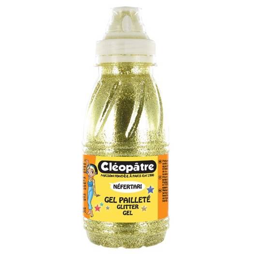 Bouteille de gel pailleté Cléopâtre doré (250ml) Ce gel apporte un effet scintillant grâce à la présence de nombreuses paillettes. les gels pailletés peuvent être mélangés avec les autres peintures Cléopâtre pour obtenir des peintures pailletées personnalisées. De plus, ce gel offre un nettoyage facile à l'eau savonneuse.